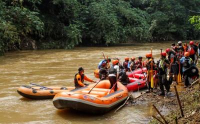 Sejumlah peserta mengikuti susur sungai Ciliwung di kawasan Cikoko, Pancoran, Jakarta, Jumat (29/11/2024). Kegiatan tersebut digelar dalam rangka peringatan Hari Bakti Pekerjaan Umum (PU) ke-79 tahun serta sekaligus mendorong kesadaran masyarakat akan pentingnya menjaga dan memelihara sungai.