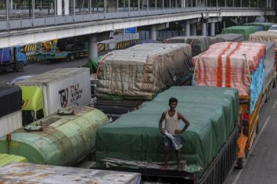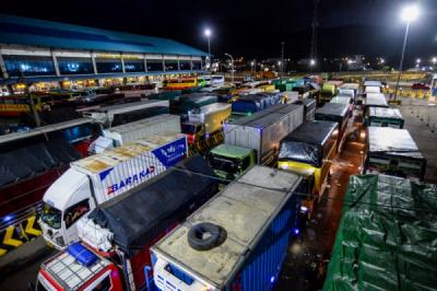 MERAK - Aktivitas bongkar muat kapal saat terjadi gelombang tinggi tampak di Dermaga Pelabuhan Eksekutif Merak, Kota Cilegon, Banten, Rabu (4/12/2024).