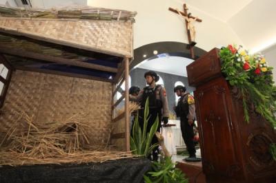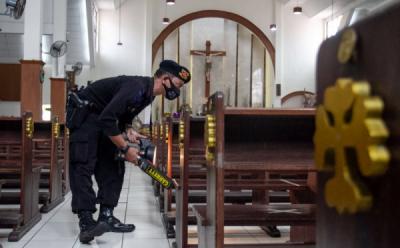 SLEMAN - Anggota Gegana Polda D.I Yogyakarta melakukan sterilisasi di Gereja Katolik Santo Aloysius Gonzaga, Mlati, Sleman, D.I Yogyakarta, Senin (23/12/2024). Tim Gegana Polda D.I Yogyakarta mensterilisasi sejumlah gereja yang akan digunakan untuk perayaan Natal guna menjamin keamanan dan kenyamanan umat kristiani dalam beribadah. ANTARA FOTO/Andreas Fitri Atmoko/rwa.