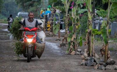 JAMBI - Pengendara melintas di jalan rusak yang ditanami pohon pisang di Kelurahan Pijoan, Muaro Jambi, Jambi, Rabu (25/12/2024). Warga setempat menyebutkan, kerusakan jalan penghubung Kabupaten Muaro Jambi dengan Batanghari tersebut disebabkan meningkatnya mobilitas angkutan pembawa material pembangunan Jalan Tol Tempino-Simpang Ness sejak beberapa bulan terakhir sehingga membahayakan pengendara. ANTARA FOTO/Wahdi Septiawan/foc.