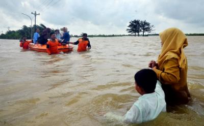 KUDUS - Warga naik perahu melintasi jalan yang tergenang banjir di Dukuh Karangturi, Desa Setrokalangan, Kaliwungu, Kudus, Jawa Tengah, Jumat (24/1/2025). Menurut warga setempat akses jalan utama sepanjang sekitar 1 kilometer tersebut terendam banjir dengan ketinggian hingga 1,5 meter dan sebanyak 450 KK terisolasi. ANTARA FOTO/Yusuf Nugroho/tom.