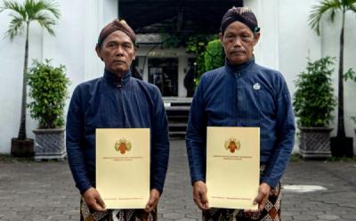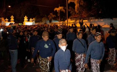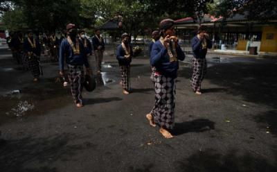 BANTUL - Abdi Dalem Keraton Yogyakarta berdoa saat prosesi adat Labuhan di Pantai Parangkusumo, Bantul, D.I Yogyakarta, Kamis (30/1/2025). Acara adat yang digelar setiap tanggal 30 bulan Rajab pada kalender Jawa tersebut dalam rangka memperingati bertahtanya Raja Keraton Yogyakarta Sri Sultan HB X.