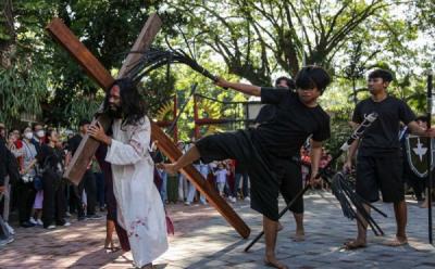 JAKARTA - Umat Katolik menampilkan prosesi Tablo Kisah Yesus Kristus saat Hari Jumat Agung di Gereja Katedral, Jakarta, Jumat (18/4/2025).