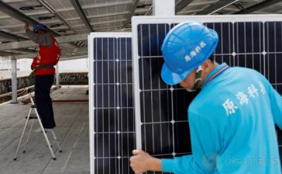 JAKARTA - Dua teknisi memeriksa panel surya yang terpasang di atap Gedung Bank Mandiri, Jakarta, Sabtu (10/5/2025). Kementerian Energi dan Sumber Daya Mineral (ESDM) telah memberikan izin pembangunan Pembangkit Listrik Tenaga Surya (PLST) atap kepada PT PLN (Persero), proyek pembangunannya memiliki kuota dengan kapasitas hingga 5.746 megawatt (MW) dalam kurun waktu 2024-2028.