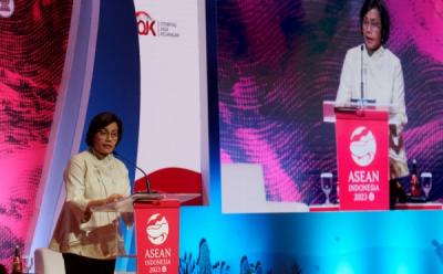 JAKARTA - Menteri Keuangan Sri Mulyani Indrawati (kedua kanan) didampingi Wakil Menteri Keuangan Thomas A. M. Djiwandono (kanan), Anggito Abimanyu (kiri), dan Suahasil Nazara (kedua kiri) mengikuti rapat kerja dengan Komisi XI DPR di Kompleks Parlemen, Senayan, Jakarta, Selasa (15/7/2025). Rapat tersebut membahas rencana kerja Pemerintah, rencana kerja dan anggaran pagu indikatif Kementerian Keuangan tahun 2026.