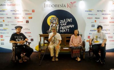 JAKARTA - Pemain Teater Koma memainkan cuplikan Mencari Semar saat konferensi pers jelang pertunjukan Teater Koma ke-235 di Galeri Indonesia Kaya, Jakarta, Kamis (31/7/2025).