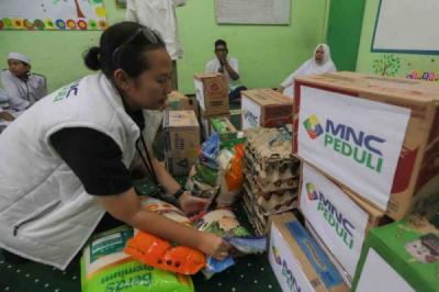 Gibran mengenakan kemeja cokelat saat menghampiri antrean pembagian sembako gratis. Dalam waktu sekitar 30 menit, satu truk sembako pun ludes dibagikan.