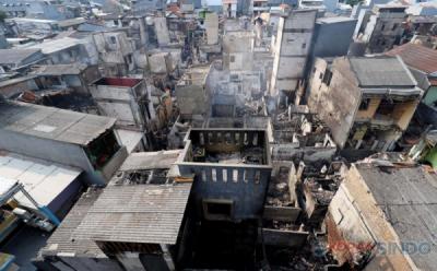 JAKARTA - Penampakan rumah hangus terbakar di pemukiman padat penduduk di Taman Sari, Jakarta Barat, Senin (29/8/2025).