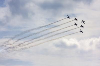 JAKARTA - Sejumlah pesawat Jupiter Aerobatic Team dari TNI AU beratraksi pada peringatan Hari Ulang Tahun (HUT) ke-80 Tentara Nasional Indonesia (TNI) di Monas, Jakarta, Minggu (5/10/2025).