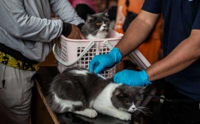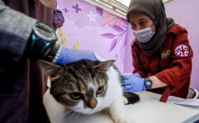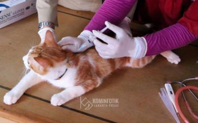 JAKARTA - Petugas menyuntikkan vaksin rabies ke seekor kucing peliharaan di Jakarta, Sabtu (11/10/2025). Dinas Ketahanan Pangan, Kelautan dan Perikanan (KPKP) Provinsi DKI Jakarta mencatat sepanjang tahun 2025 vaksinasi rabies di Jakarta sudah menjangkau sebanyak 36 ribu hewan penular rabies atau lebih dari separuh target yakni 47 ribu hewan sebagai upaya mempertahankan Jakarta sebagai wilayah bebas rabies.