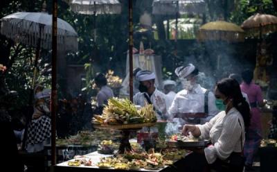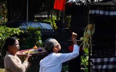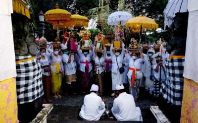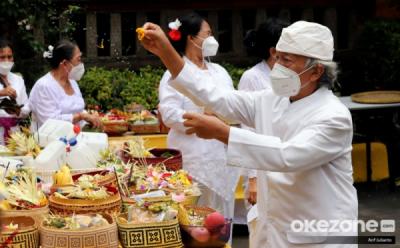 JAKARTA - Umat Hindu melalukan sesi persembahyangan Hari Raya Galungan di Pura Amerta Jati, Cinere, Jakarta Selatan, Rabu (19/11/2025).