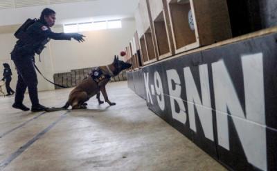JAKARTA - Petugas membawa anjing K9 saat penggerebekan lokasi yang diduga menjadi tempat peredaran narkoba di Kampung Berlan, Matraman, Jakarta, Selasa (25/11/2025). Badan Narkotika Nasional (BNN) bersama Puspom TNI AD dan Bareskrim Polri melakukan operasi pemulihan kampung narkoba yang melibatkan 450 orang personil dengan mengamankan 23 tersangka dan barang bukti diantaranya sabu dan senjata api.