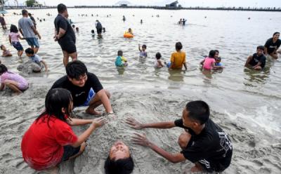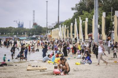 JAKARTA - Anak-anak bermain di Pantai Lagoon, Taman Impian Jaya Ancol, Jakarta, Kamis (25/12/2025). Ancol menargetkan 700 ribu pengunjung selama libur Nataru. Angka tersebut meningkat 6% dibanding tahun sebelumnya pada periode yang sama.