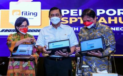 JAKARTA - Direktur Jenderal Pajak Bimo Wijayanto (kedua kanan), Bendahara Umum DPP Partai Gerindra Satrio Dimas Adityo (kanan), Anggota DPR Komisi XI Wihadi Wiyanto (kedua kiri), Anggota DPR Komisi V Novita Wijayanti (kiri) memberikan keterangan kepada wartawan usai kegiatan kegiatan sosialisasi penerapan sistem Coretax di DPP Partai Gerindra, Jakarta, Senin (19/1/2026). Direktorat Jenderal Pajak (DJP) Kementerian Keuangan menggelar sosialisasi perdana kepada DPP Partai Gerindra mengenai penerapan sistem perpajakan terpusat dan ketentuan pajak melalui sistem Coretax.
